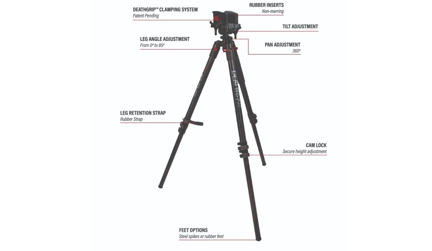 Le trépied BOG DeathGrip Carbon Fiber est conçu pour être le trépied de précision le plus stable du marché. Les jambes en fibre de carbone réduisent son poids total, ce qui le rend très portable sans sacrifier la stabilité. La force des jambes en fibre de carbone diminue la quantité de flexion, ce qui rend ce trépied de précision extrêmement précis, même pour les chasseurs débutants. Sa pince brevetée verrouille solidement toute arme pour un repos solide et sans les mains.