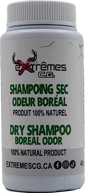 Shampoing sec pour les cheveux, produit 100% naturel à odeur boréal pour un contrôle extrême des odeurs.